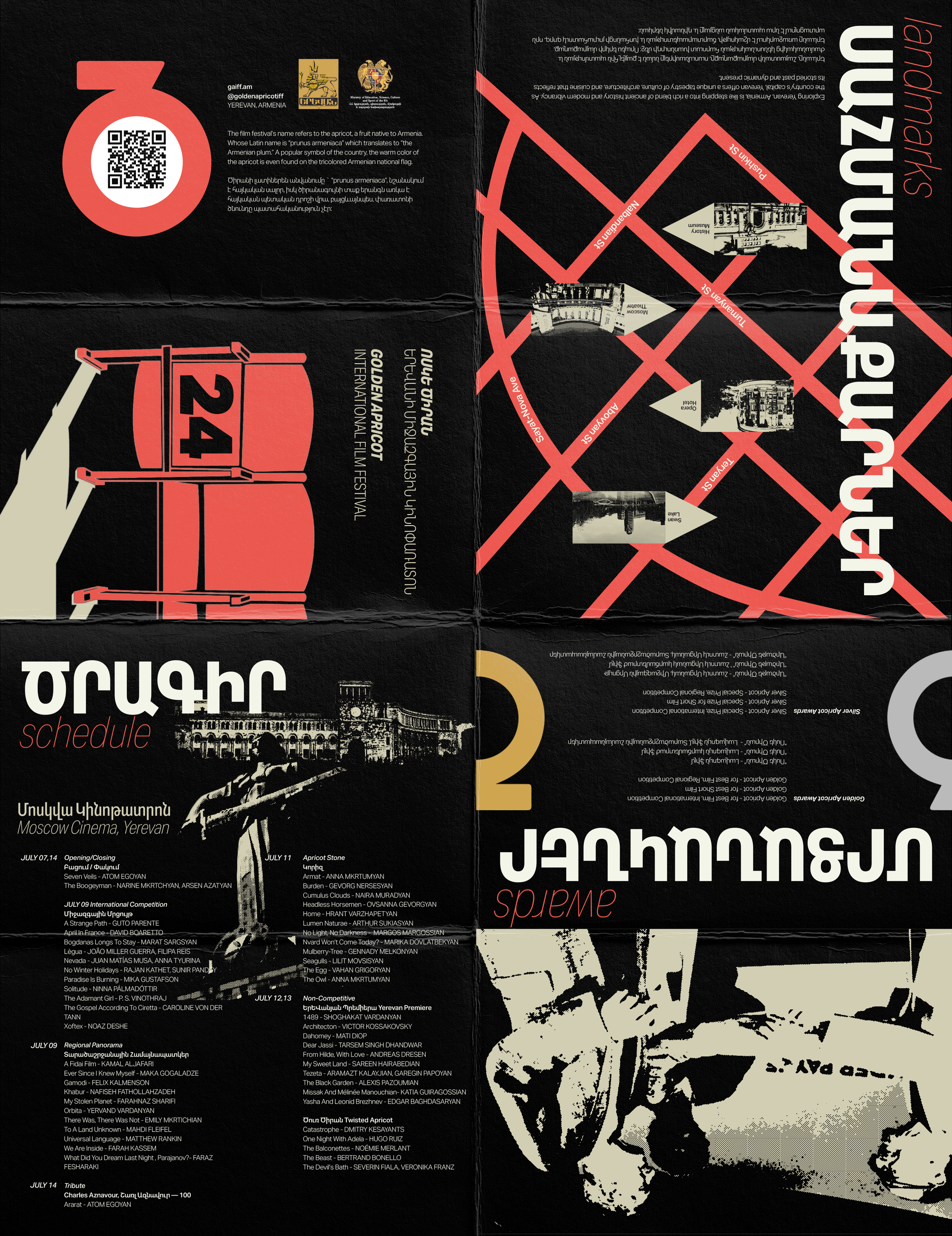 Designed as a concept for the Golden Apricot Film Festival in Yerevan, Armenia to communicate the film festival’s agenda and history to the Armenian and international audiences. The poster utilized a classic 8-panel zine fold to allow the information to be flipped through.